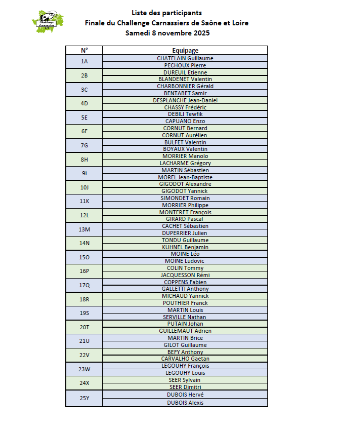 Une fois un binôme qualifié, si l’un des deux membres participe à un autre challenge carnassier avec un coéquipier différent, ce nouveau binôme sera considéré comme non qualifiable pour la Finale.