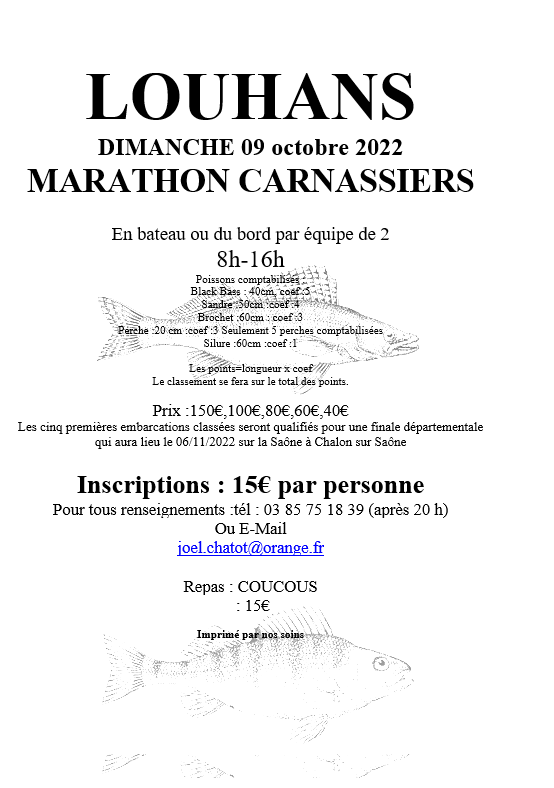 La finale de ce Challenge Carnassiers se déroulera le dimanche 6 novembre 2022 sur la Saône à Chalon-sur-Saône. Elle réunira 25 binômes en bateau sélectionnés lors d’épreuves qualificatives.