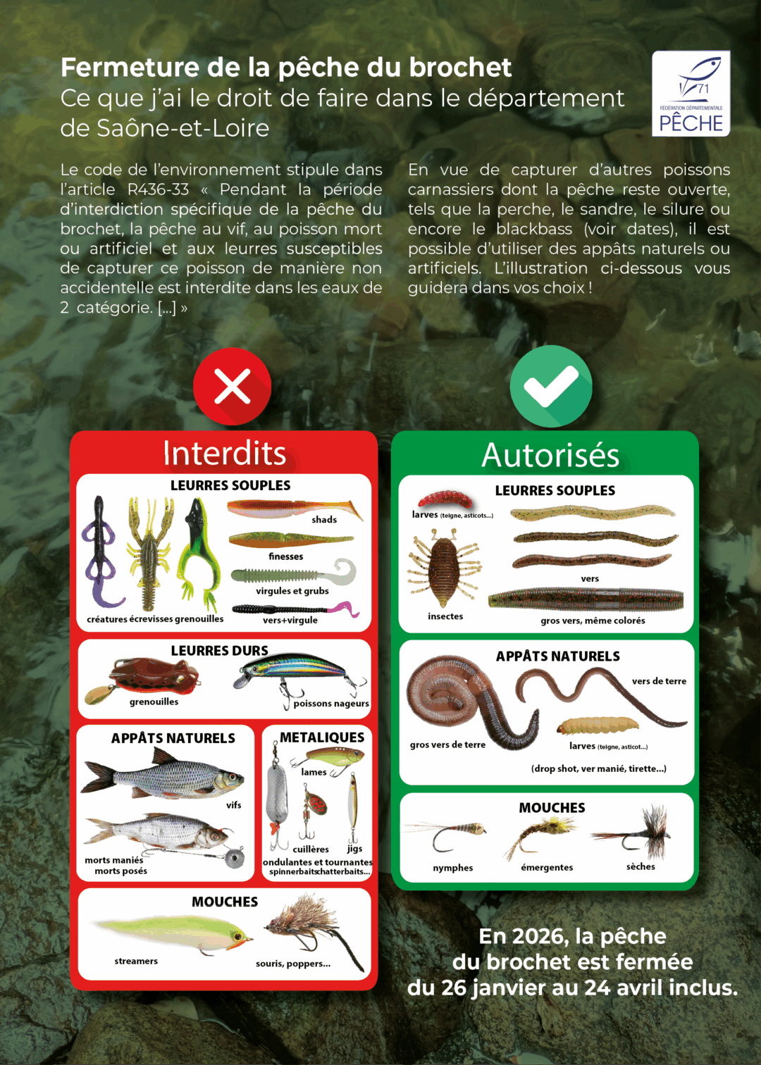 La pêche du brochet ferme du dimanche 25 janvier (18h04) jusqu’au vendredi 24 avril inclus. En effet, il est temps de ranger les cuillères, les leurres imitant poissons, grenouilles ou écrevisses ainsi que les montages pour la pêche au poisson vif ou mort. Cette fermeture à pour objectif de permettre à l’espèce de rejoindre les annexes hydrauliques des rivières ou les zones rivulaires des plans d’eau afin de s’y reproduire, la reproduction étant l’une des phases clés de son cycle biologique.