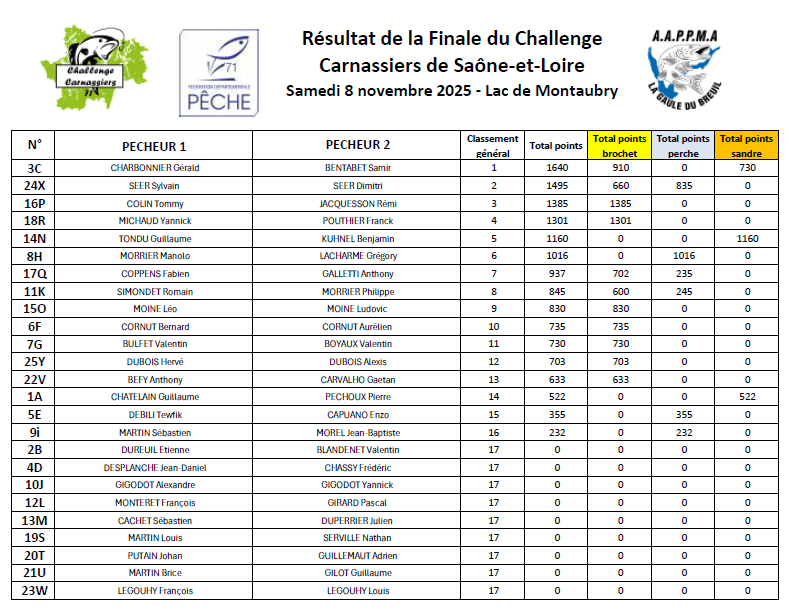 RESULTATS – FINALE DU CHALLENGE CARNASSIERS 71