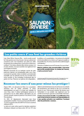 « Les petits cours d’eau subissent de multiples transformations qui pèsent sur la biodiversité aquatique, les poissons et le cadre de vie des Français. Pourtant, ces écosystèmes regorgent de vie. Ils font les grandes rivières et la beauté de nos territoires. Les pêcheurs et leurs instances sont en première ligne pour défendre ce patrimoine. Notre mobilisation ne suffira pas. L’engagement de chacun est aujourd’hui indispensable.»